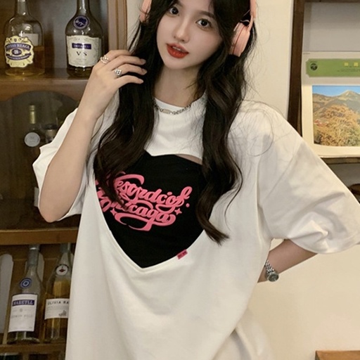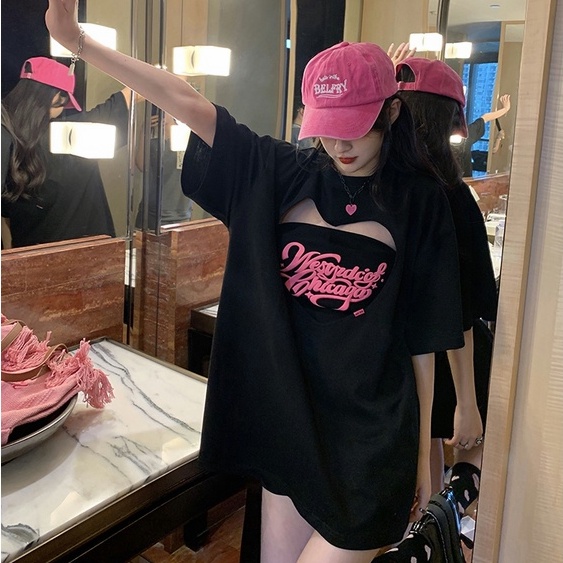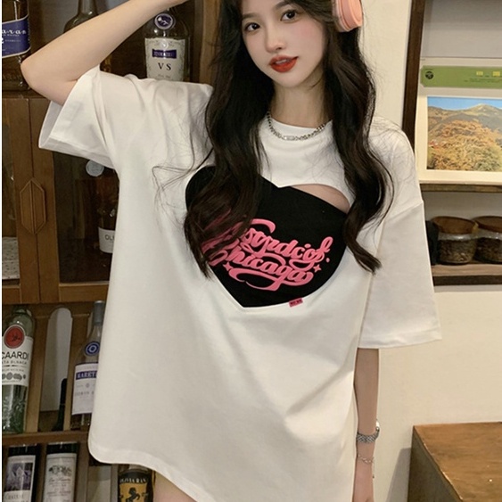 【飯團原創】愛心 長版上衣 短袖上衣 oversize 韓版上衣 抹胸 辣妹上衣 ins風 寬鬆 顯瘦 女生上衣 純棉
